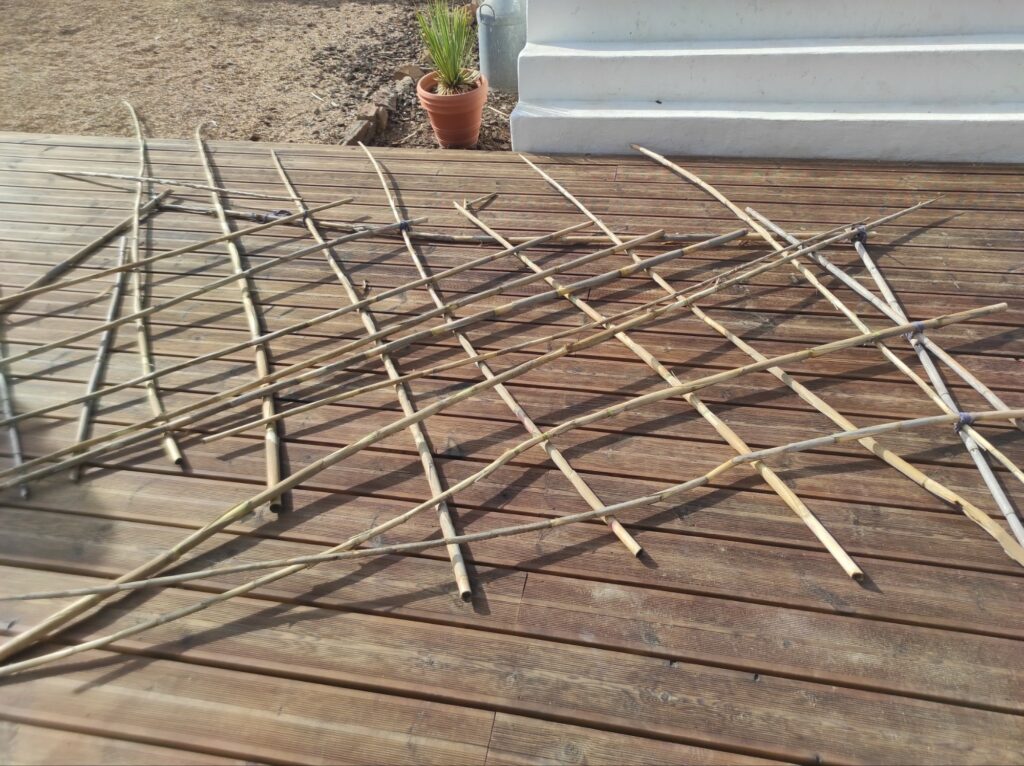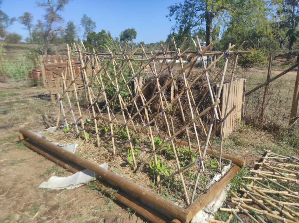 Um die Gitter für die Bohnen zu bauen, haben wir Bambusäste zugeschnitten und dann mit Draht, Schnüren und Kabelbinder aneinander gebunden. Dann haben wir sie in den Beeten windsicher aufgestellt. Jetzt können die Bohnen an ihnen hinauf klettern 🙂