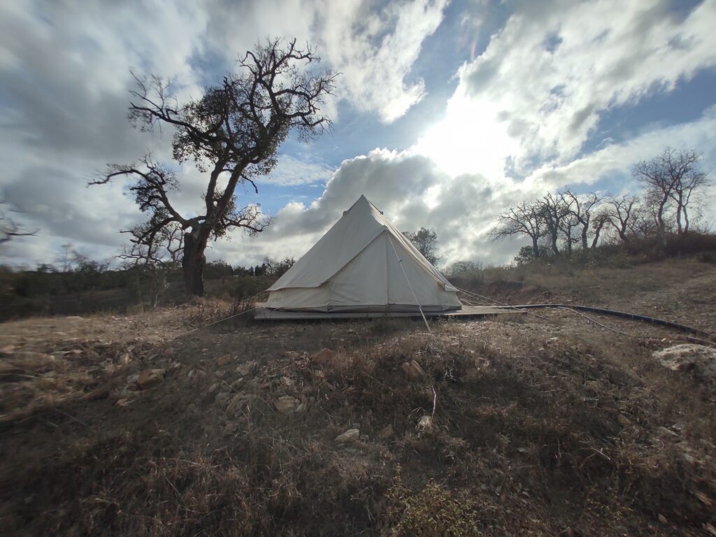 Ich schlafe im Wohnwagen bzw. 3 Nächte mit den andern 2 im Zelt. Es gibt eine Outdoor-Küche, die zwar überdacht, aber rundherum offen ist.