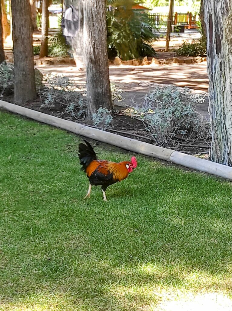 Außerdem gibt es einen sehr schönen Park mit verzweigten Wegen, in dem viele Hühner herumlaufen.