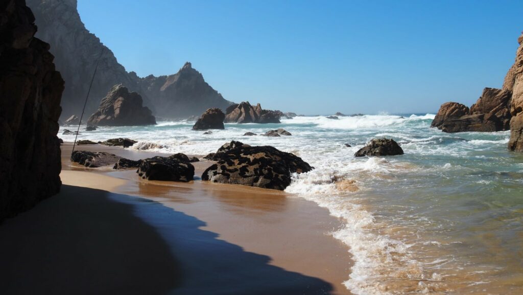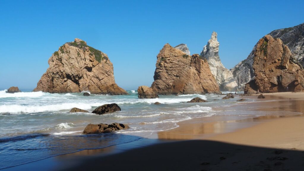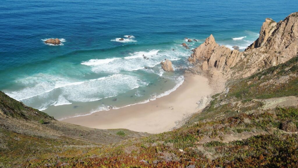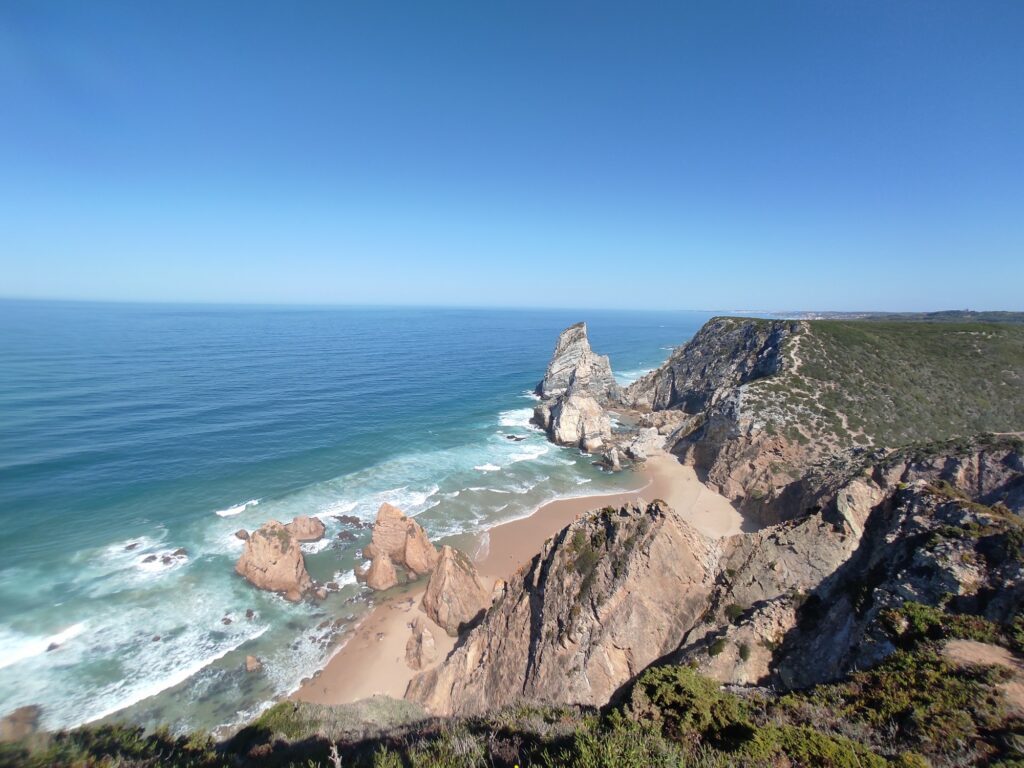 Es ist aber trotzdem unglaublich schön dort. Ich bin ein bisschen die Klippen entlangspazieren und dann irgendwann zu einem Strand hinuntergeklettert. Dort war dann auch fast niemand mehr. Außerdem kann man auch einfach seine Sachen am Strand liegen lassen (z. B. die Kamera), weil niemand freiwillig mit noch zusätzlichem. gepäck die Kippen wieder hinaufgeklettert. Ich habe mir dann noch den Sonnenuntergang am Strand angesehen und bin dann zurück zum Cabo da Roca gegangen. Dort war soooooo unglaublich viel los. Kaum zu glauben, dass ein paar 100 Meter weiter fast niemand war!