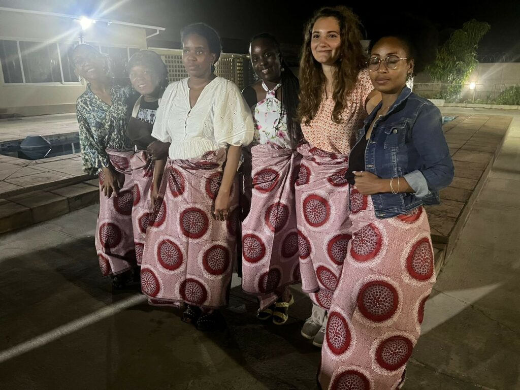 Nachdem ich die vielen verschiedenen Nachspeisen ausprobiert hab, wurden ein paar Reden gehalten und dann die ur große Geburtstagstorte angeschnitten. Danach haben alle eine Capulana ungebunden bekommen und es wurde getanzt. Die 4 Personen, die die Party organisiert haben, haben sich in die Mitte gesetzt und alle anderen sind rundherum getanzt. Meine Gastmama hat einen Korb gehalten und jeder hat ein bisschen Geld hineingegeben, das für die Partyorganisatoren bestimmt war. Danach wurden verschiedene andere Tänze getanzt. Ich habe versucht mitzumachen und meine Gastschwester hat sich wirklich Mühe gegeben, es mir beizubringen, aber leider bin ich nicht so talentiert im Tanzen…
