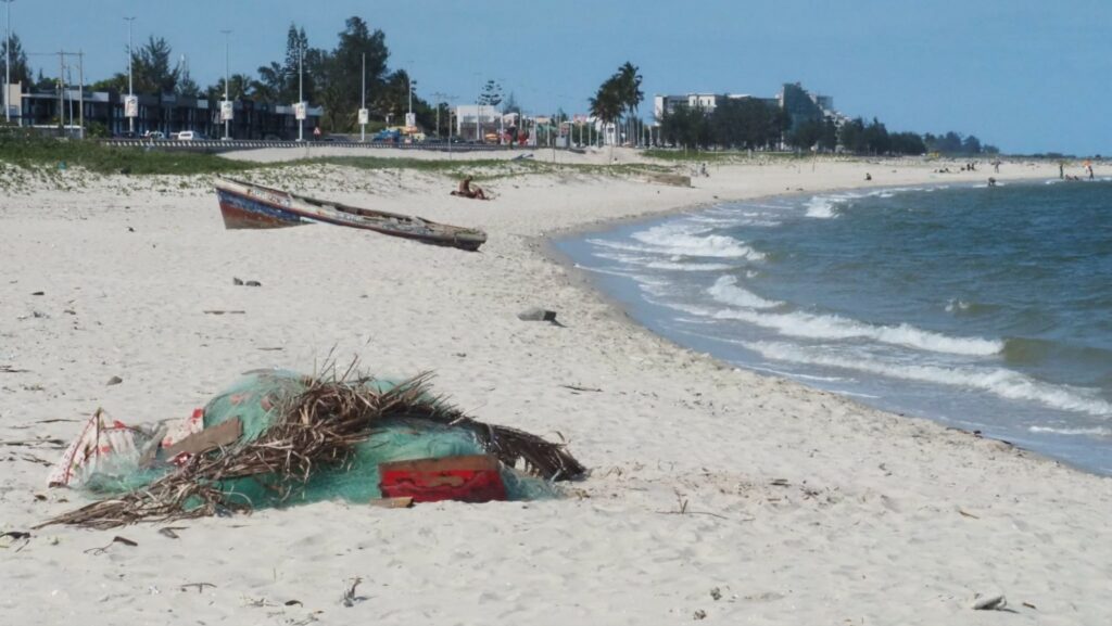 Mosambik liegt am Indischen Ozean. Im Wasser sind ziemlich viele große Quallen. An manchen Stellen ist das Meer etwas verschmutzt, an anderen aber voll klar. Man kann die Küste von der Ilha Inhaca sehen. Das Wasser ist hier ziemlich warm, aber draußen ging ein frischer Wind. Wir haben es uns also in zwei Campingsessel gemütlich gemacht und die frische Luft, das Meeresrauschen und die Aussicht genossen. Immer wieder sind Verkäufer vorbeigekommen und wollten uns irgendwas andrehen. Z.B. einen kleinen Holztisch, den man auseinander nehmen und mitnehmen kann, und ein integriertes Schachbrett hat.